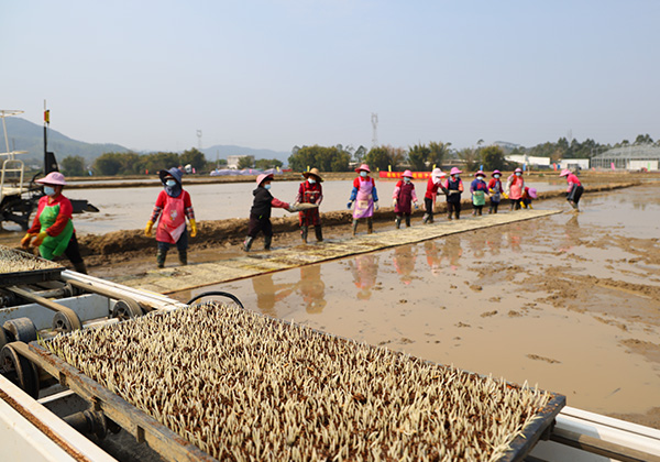自动化育秧输送带上,秧盘一路前行,播种、水分分别从机器出口和喷滴管均匀分布在基质上,不到一分钟完成落谷,通过输送带送到田间……