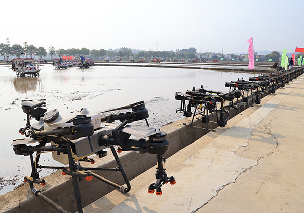 春耕现场出动了多台农用无人机、无人驾驶拖拉机,特别引人注目,吸引众多种植户在田间观摩学习。