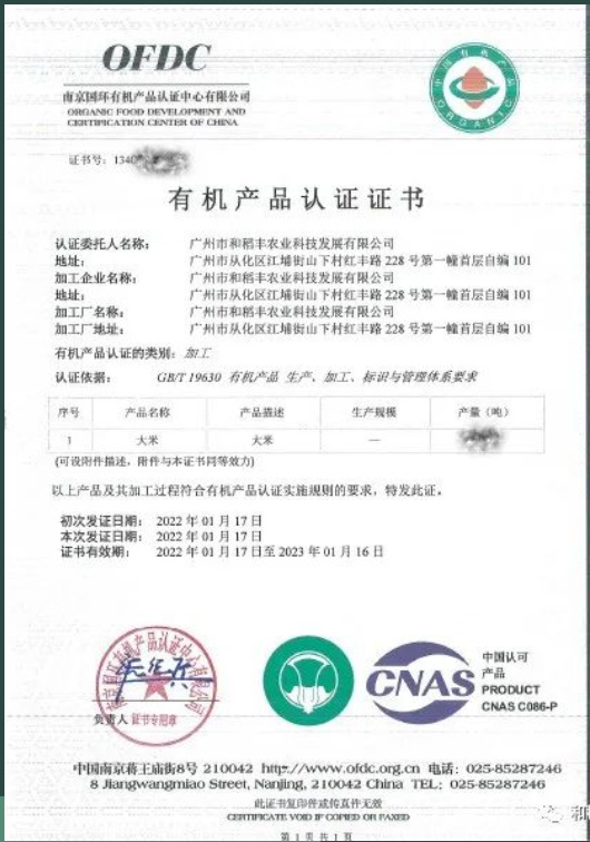 实至名归,和稻丰部分大米获国家有机产品认证!