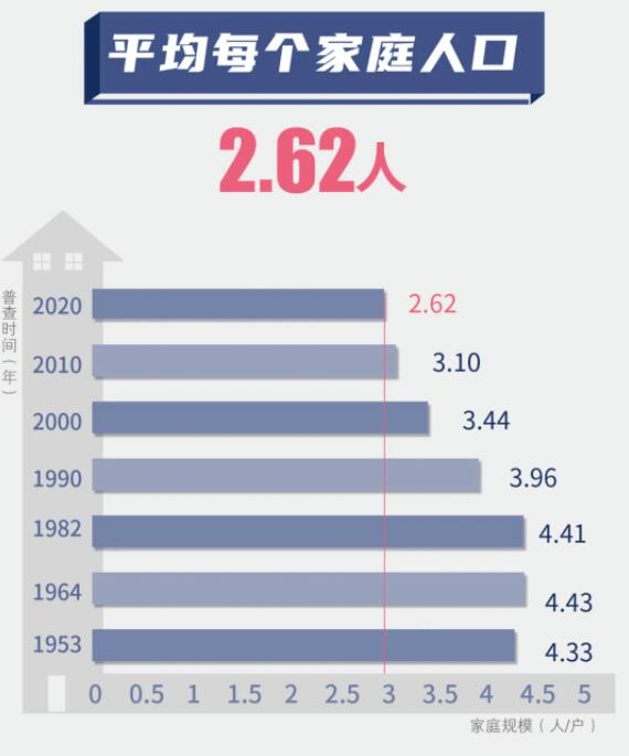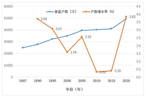 而中国家庭户数量不断增长,2010年继续突破4.02亿户;2020年家庭户数达到4.94亿户,10年间年均增长率升高2.1%。